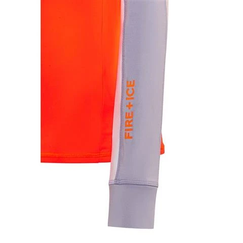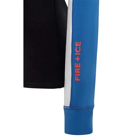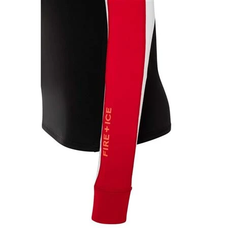 Quick dry first layer with stripe color block for sleeves and shoulders. Glossy logo print at lower left sleeve.