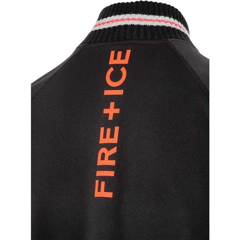Hybrid tech sweater with powerstretch shoulders, upper sleeves, upper front body and back. Raglan sleeves. Ribbed collar, hem and sleeve hems. F+I print at upper center back. Contrast stripes at collar and mid sleeves.