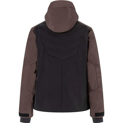 Hybrid ski jacket with 4-Way stretch nylon for body and contrast polyester for sleeves, shoulders and hood. Bonded quilting on the top half of body. Mesh inside veents. Velcro adjustable sleeve hems. Rubber logo at upper left sleeve.