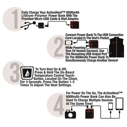 The ActionHeatโข battery heated vests are revolutionary in the world of heated clothing. Using the patented 5V signal technology, it allows for any 5V battery to be used with the ActionHeat Jackets and Vests. This allows for unlimited battery options and gives you more options! The ActionHeat Jacket comes with a super powerful ActionHeatโข 5V Power Bank 6000mAh. This powerbank powers your jacket and can also charge your phone, tablet, or any USB charged device. Note: Heating times will deminish if used to charge other devices.