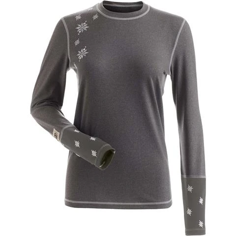 Midweight heathered crewneck with snowflake embroidery, natural wicking properties and contrast coverstitch.