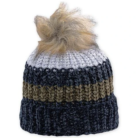 Chunky chenille rib-knit beanie with cuff, super soft, faux fur pom
